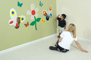Two mirror butterflies and wall Design stick-on vinyl butterflies circling a See Me Flower. Shatter-resistant Acrylic mirrors reflect child's every emotion and movement. Screws not included. Sizes Vary