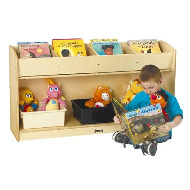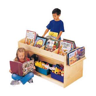 BOOK BROWSER The BOOK BROWSER is a must have for your preschool or daycare! Mobile cart for displaying books plus storage below for puppets and supplies. Book display easels on both ends. KYDZSafe edges. Eight section top. Caster mounted. Minimal assembly. Bottom shelves are 46 in wide x 11 in deep x 14 1/2 high.
