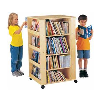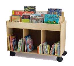 Talk about a mobile library! This sturdy two-sided cabinet has room for hundreds of books along with compartments underneath for magazines, supplies, etc. Features heavy-duty casters so one adult can move it around the room or school Dimensions: 44in wide x 30in high x 19in deep Item#TCWB0383