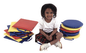 - CIRCLE Each set has 2 red, 2 blue, and 2 yellow 1in. thick soft foam cushions. Each has a handle for carrying. Measures 15L x 15W x 2.5H. Item#VACF349-014 |